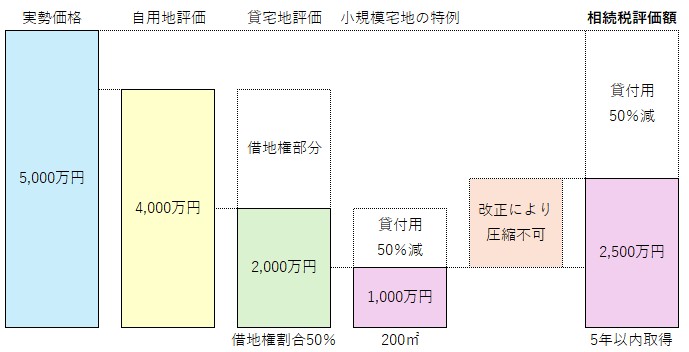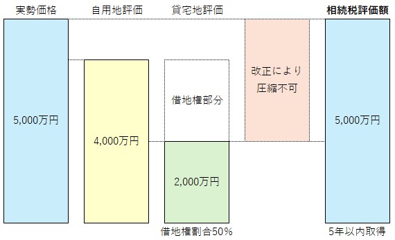被相続人等が課税時期(相続開始日や贈与日)前5年以内に取得した一定の貸付用不動産については、課税時期における通常の取引価額に相当する金額(原則として取得価額を基に算定した金額)によって評価することになりました。